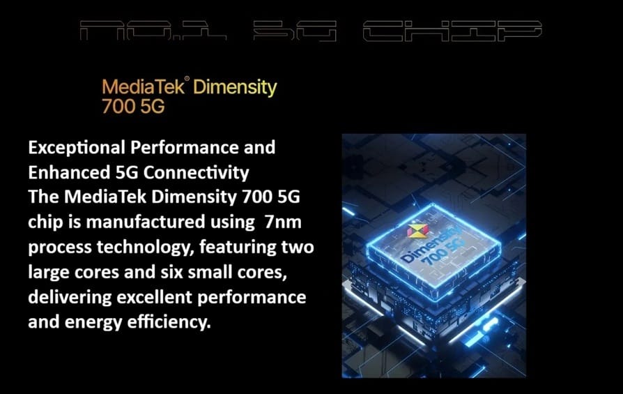 The MediaTek Dimensity 700 5G chip is manufactured using the latest 7nm process technology, featuring two large cores and six small cores, delivering excellent performance and energy efficiency. It also supports the latest 5G network and can support multi-mode and multi-band 5G connections.